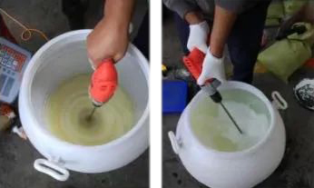 稀釋方法:先將抑塵劑A料(粉料)加入容器中(容器中必須存儲(chǔ)部分水,避免抑塵粉料粘附容器底部)然后邊加入剩余水分邊攪拌,短暫攪拌后(使粉料分散),加入抑塵劑B料(液料)攪拌(2-5min)即成(特征為液體呈現(xiàn)出半透明膠狀)。抑塵劑成品如圖所示。