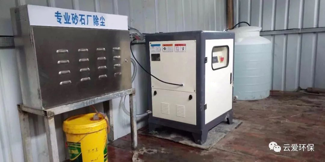 云愛環(huán)?;钚愿伸F抑塵設(shè)備是我們根據(jù)砂石廠除塵的具體工況為中小型砂石廠量身打造,綜合采用活性磁化技術(shù)、納米捕塵技術(shù)、高壓干霧技術(shù)、云霧除塵技術(shù)、捕塵劑自動(dòng)比例添加技術(shù)集合而成,一是從源頭解決砂石廠粉塵產(chǎn)生問題,二是杜絕了泡沫干霧抑塵裝置造價(jià)高昂投資較大的缺點(diǎn)。抑塵設(shè)備由:水源凈化裝置、藥劑自動(dòng)配比裝置、活性干霧主機(jī)、噴霧組件、水電連接管線及附件等組成,干霧抑塵設(shè)備產(chǎn)生直徑在1µm-100µm的水霧顆粒,對生產(chǎn)設(shè)備產(chǎn)生的粉塵進(jìn)行有效地吸附,使粉塵受重力作用沉降,從而達(dá)到抑塵作用。