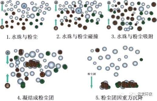 美國《煤炭時(shí)代雜志》發(fā)表的題為“科羅拉多礦業(yè)學(xué)院解決可吸入塵埃的控制”一文中提到:水霧顆粒與塵埃顆粒大小相近時(shí)吸附、過濾、凝結(jié)的機(jī)率大為原理, 水霧顆粒與塵埃顆粒大小相近時(shí),塵埃顆粒隨氣流運(yùn)動(dòng)時(shí)與水霧顆粒發(fā)生碰撞、吸附、凝結(jié),形成的塵埃團(tuán)在重力作用下降落,從而達(dá)到過濾塵埃的目的。