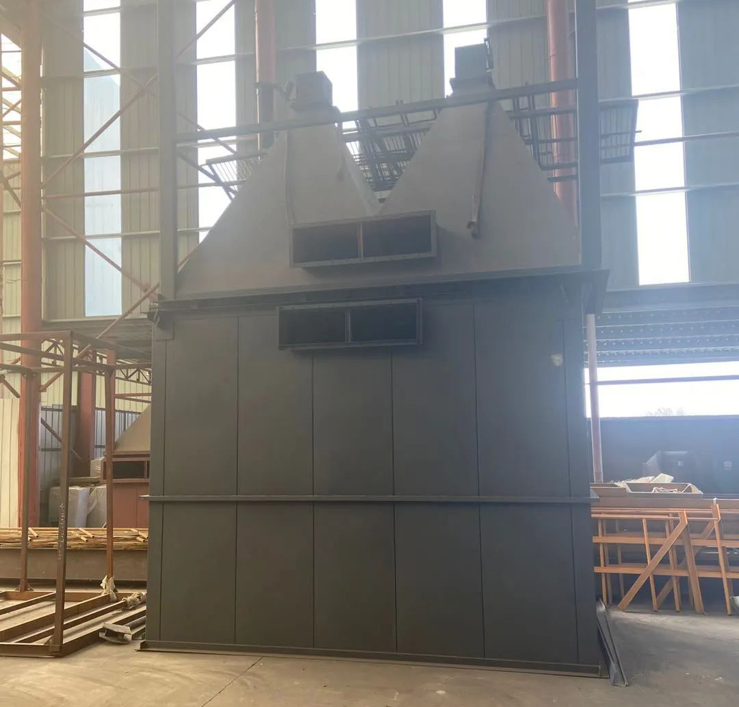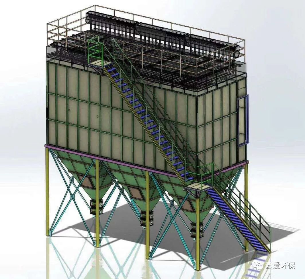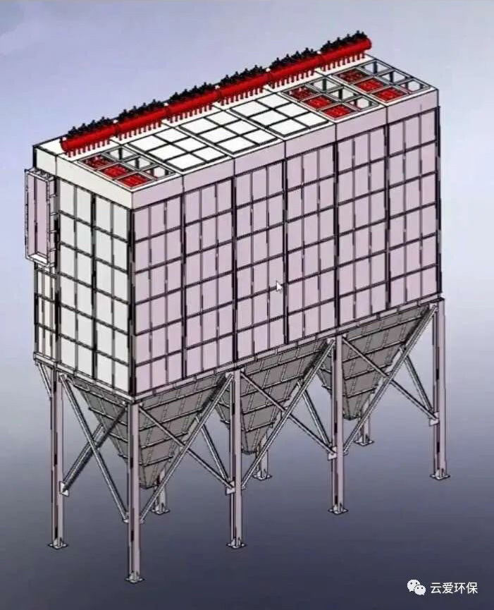 袋式除塵器本體結(jié)構(gòu)主要由上部箱體、中部箱體、下部箱體(灰斗)、清灰系統(tǒng)和排灰機(jī)構(gòu)等部分組成。